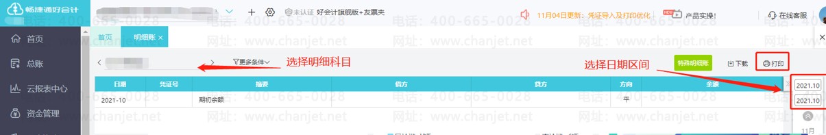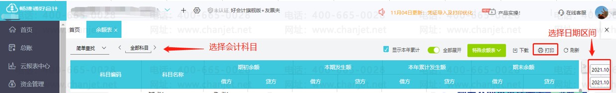 4.1选择会计科目,对应的日期区间,根据需要勾选显示本年累计,点击打印