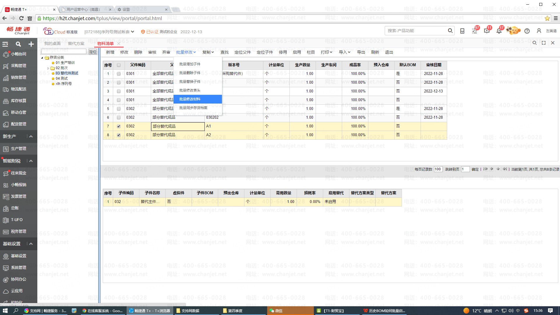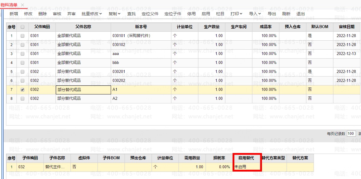 弃审后再选择需要修改的BOM,点击表头的【批量修改-批量修改材料】,如此时需要批量修改父件0302版本号为A1和A2的物料清单启用替代方案: