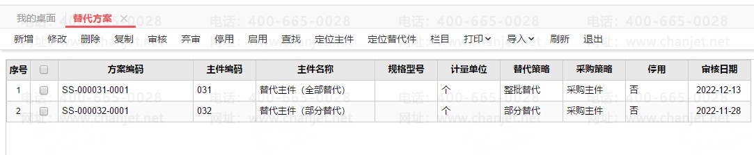 再进入【基础设置】-【物料清单】将需要启用替代的BOM先弃审(不弃审批量修改会提示修改失败),审核日期空白表示物料清单是未审状态: