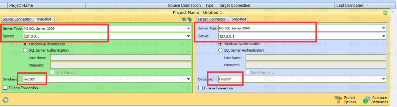 2.登陆后,数据库要选择sql server2005,数据库是08数据库也选择这个,server默认本机ip:127.0.0.1,在下面左边选择正常的数据库即新建的空白正常账套数据库,右边选择有问题的数据库即原始报错账套数据库。确认无误后点comparedatabases