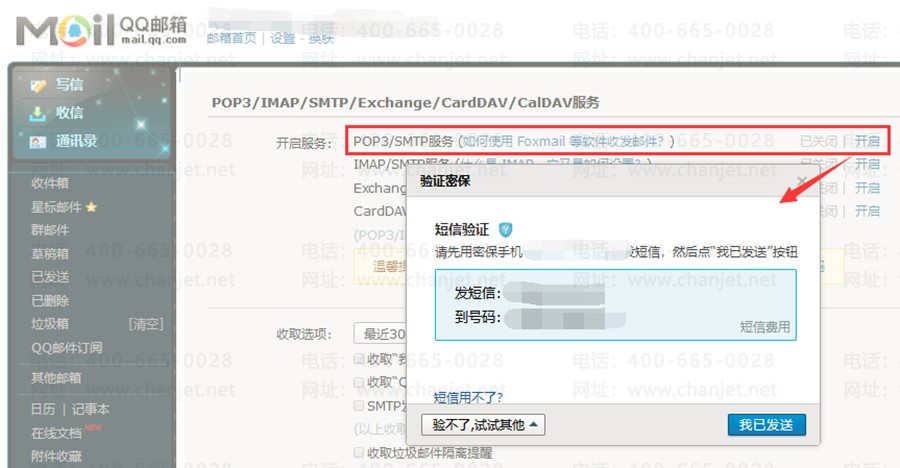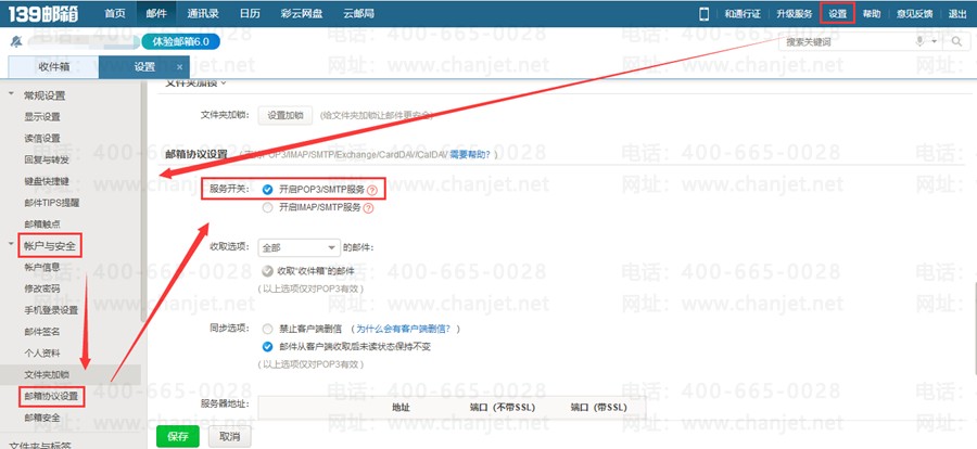 8、若发送邮件的邮箱为139邮箱,首先登录邮箱,在邮箱首界面点击上方菜单栏的【设置】,选择【帐户与安全】页签,找到【邮箱协议设置】点击【开启POP3/SMTP】按钮,设置完毕点击【保存】后需验证信息才可生效。