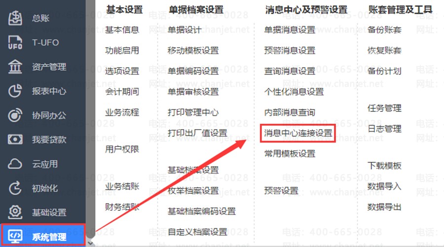 1、依次点击【系统管理】-【消息中心连接设置】。