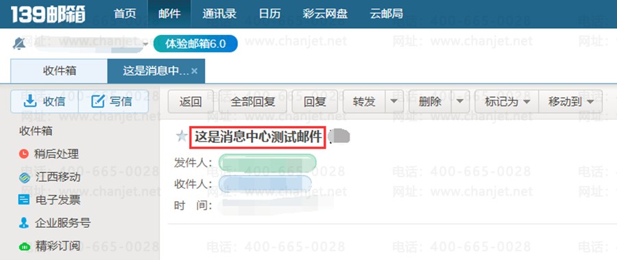 10、返回到软件【消息中心连接设置】界面,维护【发送邮件服务器(SMTP)】为smtp.139.com,【发送邮件地址】为自己的邮箱地址,若同一邮件有多人接收,可勾选【同一邮件多收件地址时,按收件人分别发送】,【授权码】为139邮箱的登录密码,【端口】一般默认为25或465,最后可点击【连接测试】,若测试成功,则当前邮箱会接收到一封测试邮件。