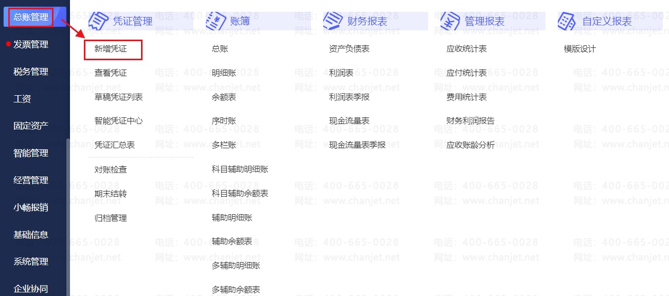 1、点击【总账管理】-【新增凭证】
