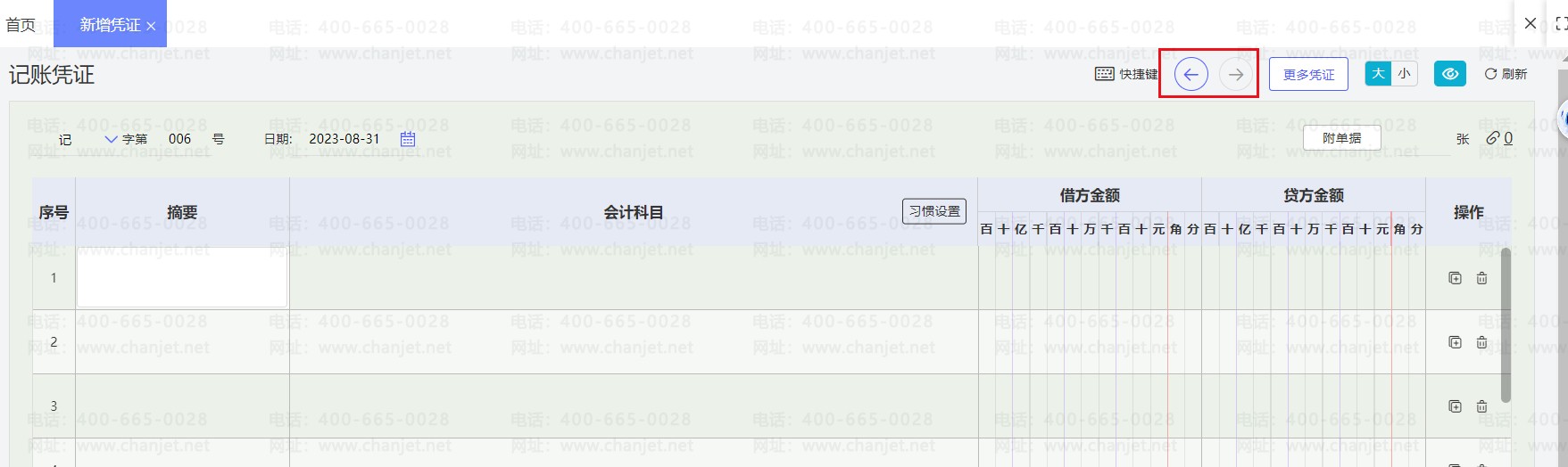 2、点击右上角的左、右箭头,找到对应要作废的凭证