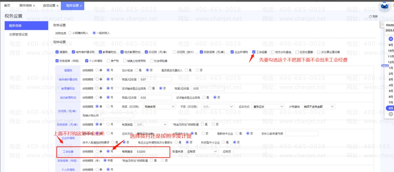 1.在【系统管理】-【选项设置】-【税务设置】勾选工会经费,选择按月或者按季度申报以及填写申报比例。