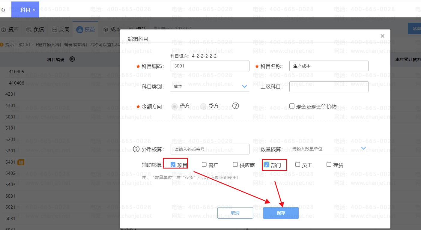3、然后勾选【部门】、【项目】,然后点击【保存】
