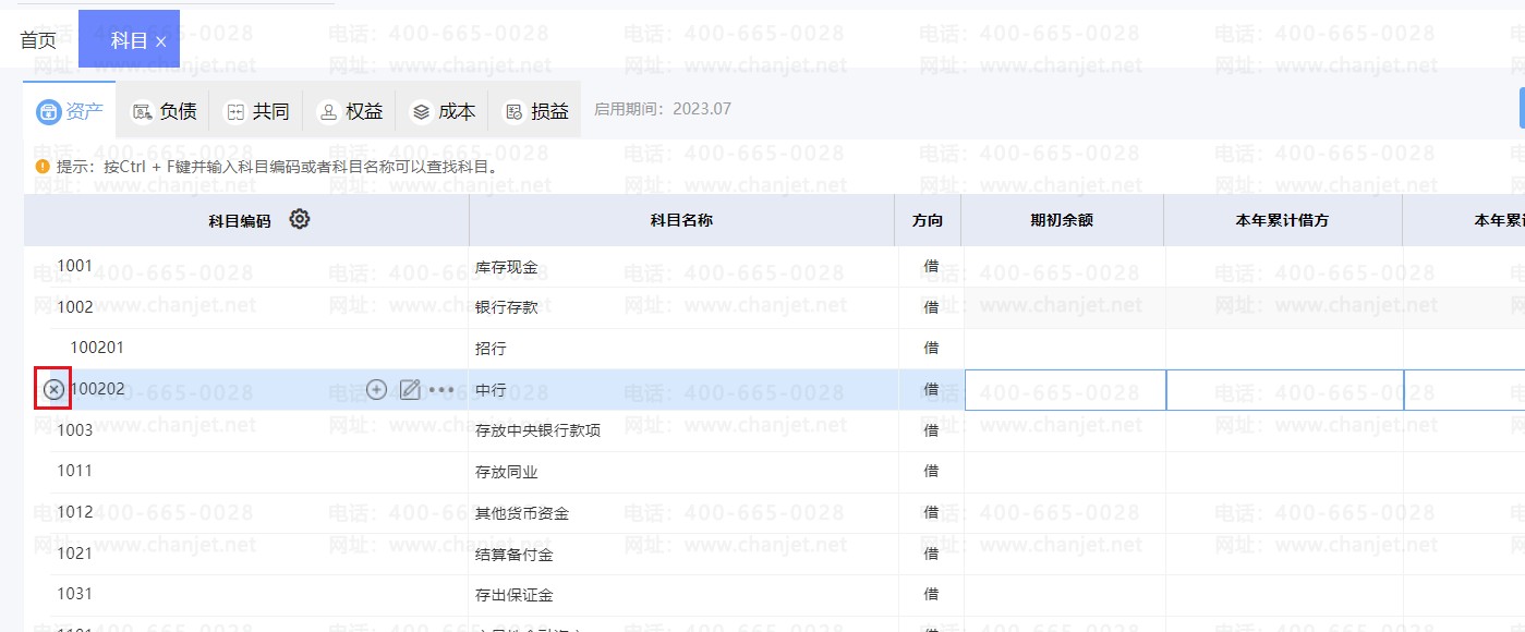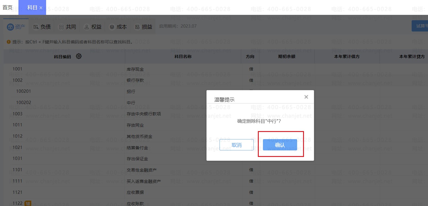 注意:若科目已经使用有数据的情况下,科目无法进行删除。