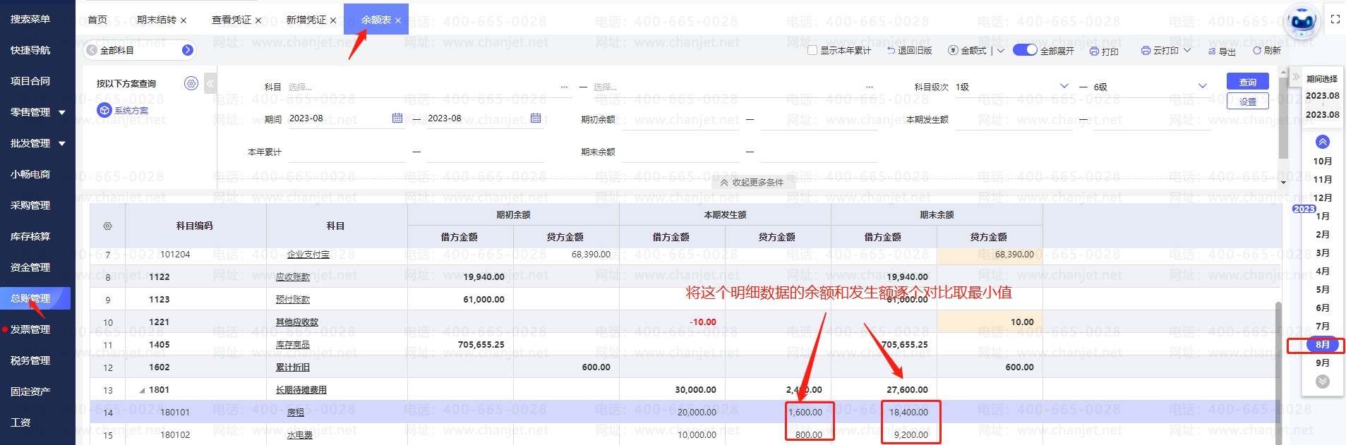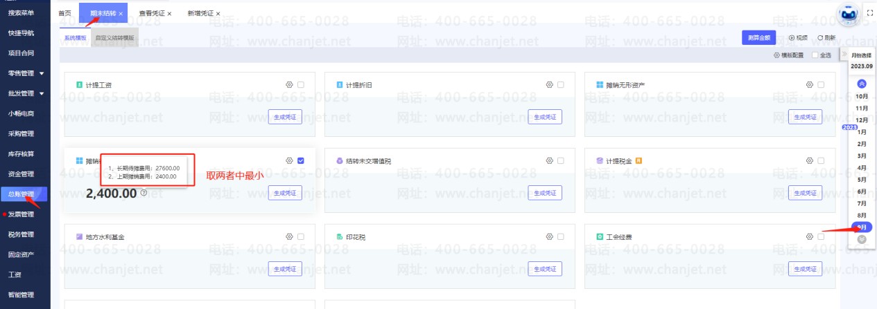 2.点击【总账管理】—【期末结转】,选到9月份(下个月),点击【测算金额】,可查看生成的摊销凭证,如下图,图中:1、长期待摊费用27600.00元,取的是9月份余额表上长期待摊费用科目的借方余额,2、上期待摊费用2400.00元,取的是8月份长期待摊费用科目的贷方发生额