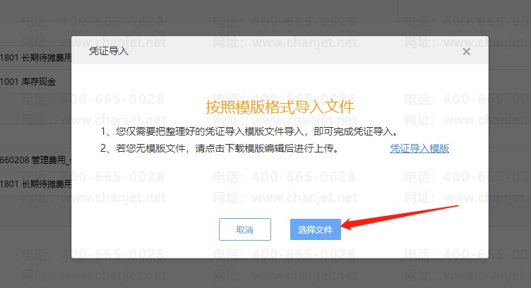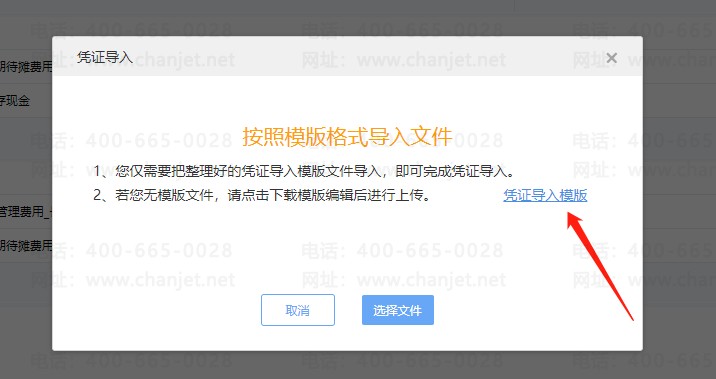 3.弹出的提示,如果没有模板文件,点击【凭证导入模板】下载模板进行维护