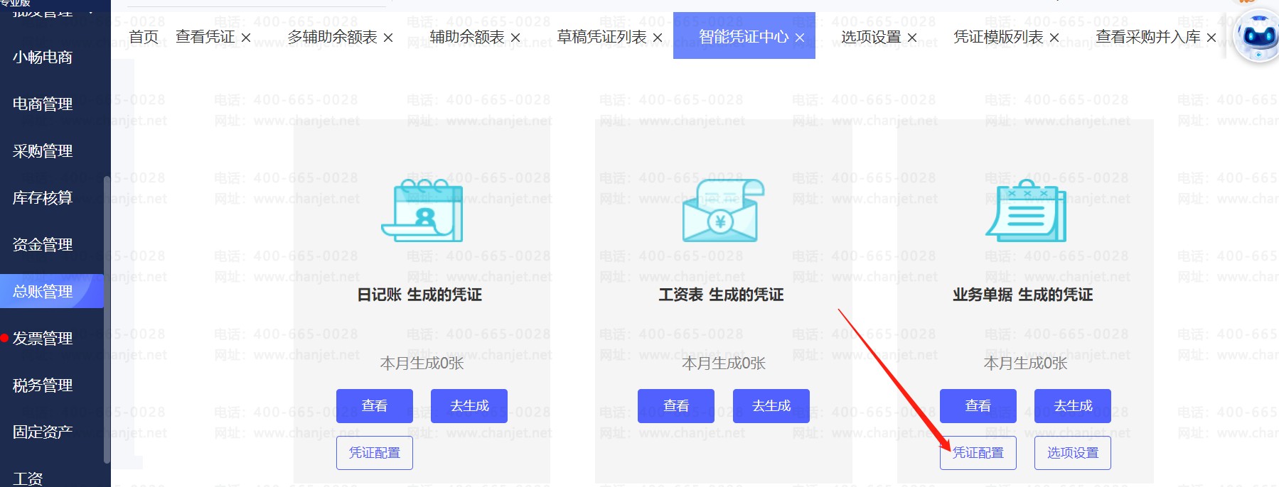 1.点击【总账管理】-【智能凭证中心】-【凭证配置】,点击放大镜进入到查看界面,点击右下角的【编辑】,生成实际改成:自动,在点击【保存】