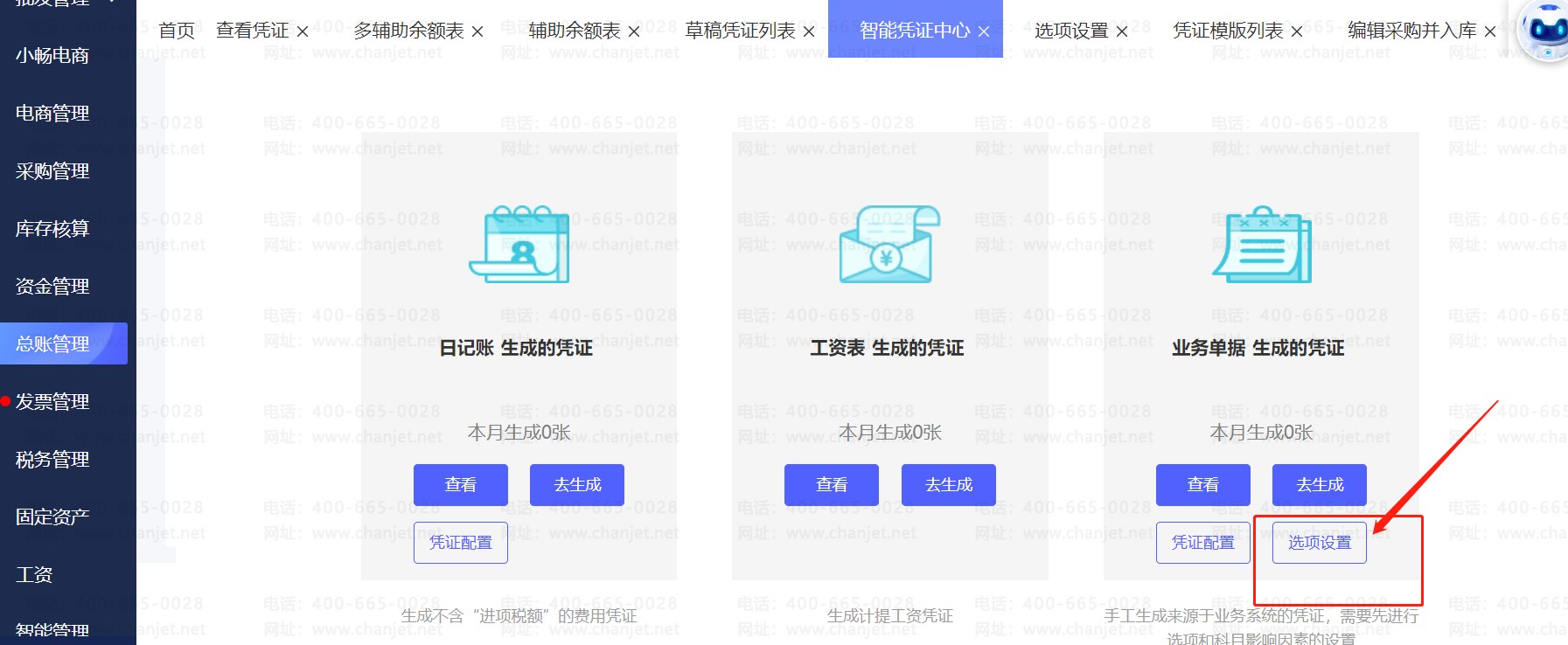 2.点击【总账管理】-【智能凭证中心】-【选项设置】,您可以设定单据生成凭证的时机,改成:实时,保存