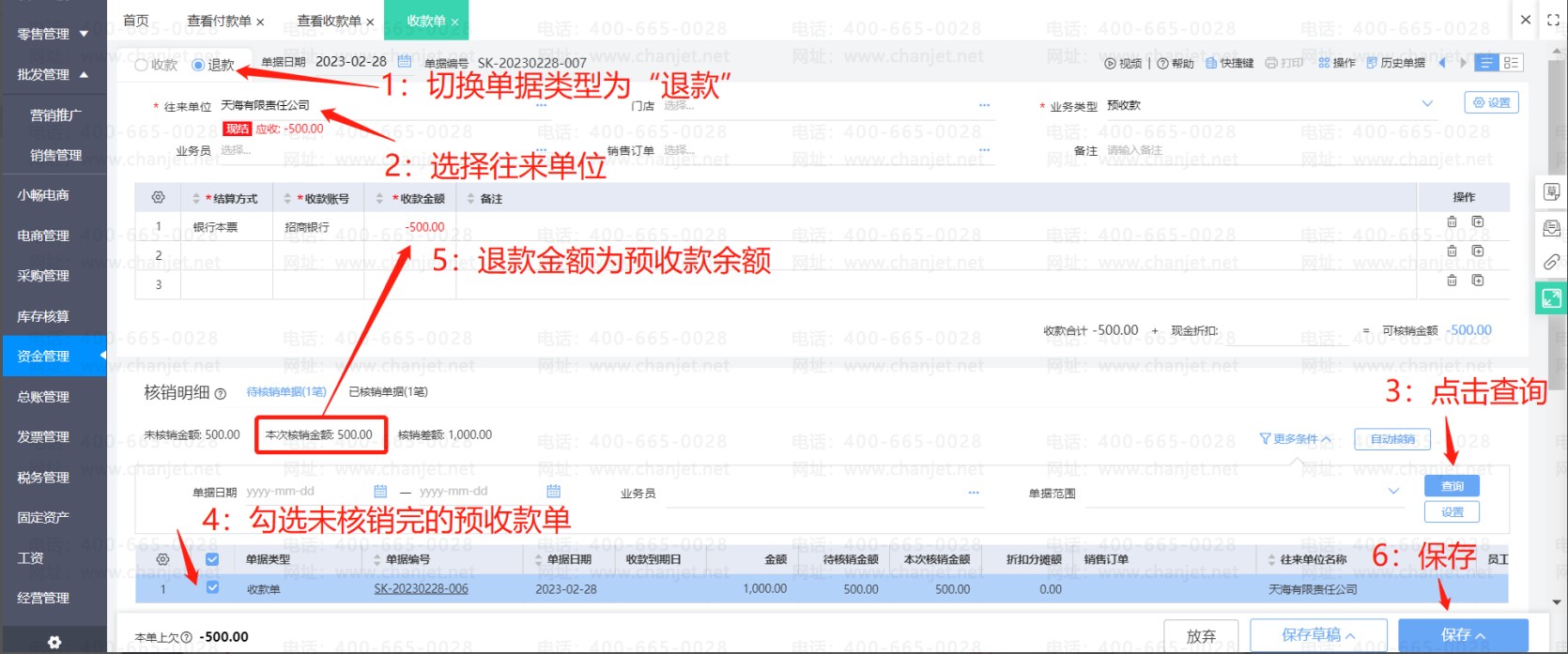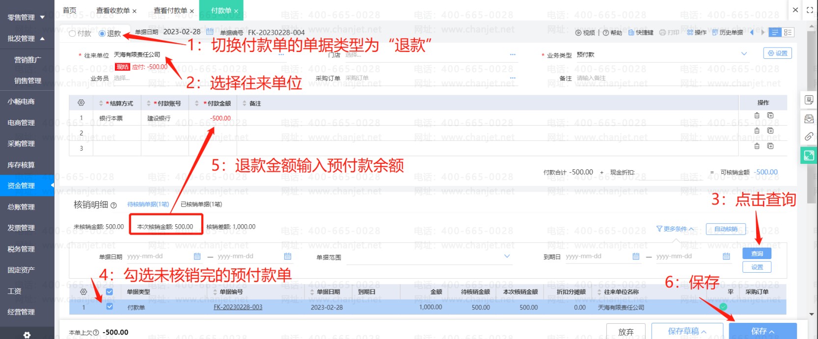 ② 需要冲销掉预收金额,剩余预付进行退款操作