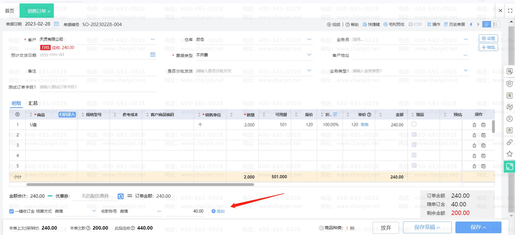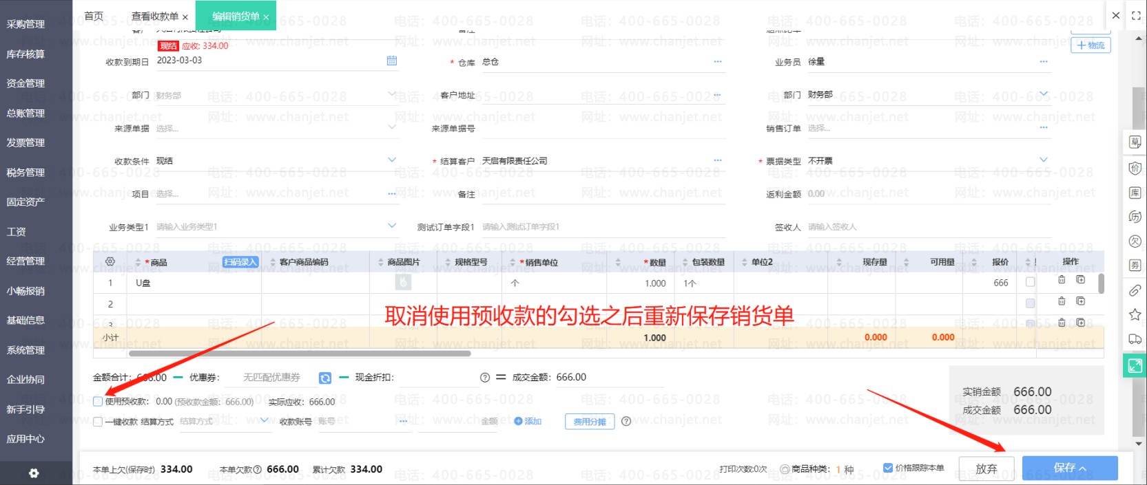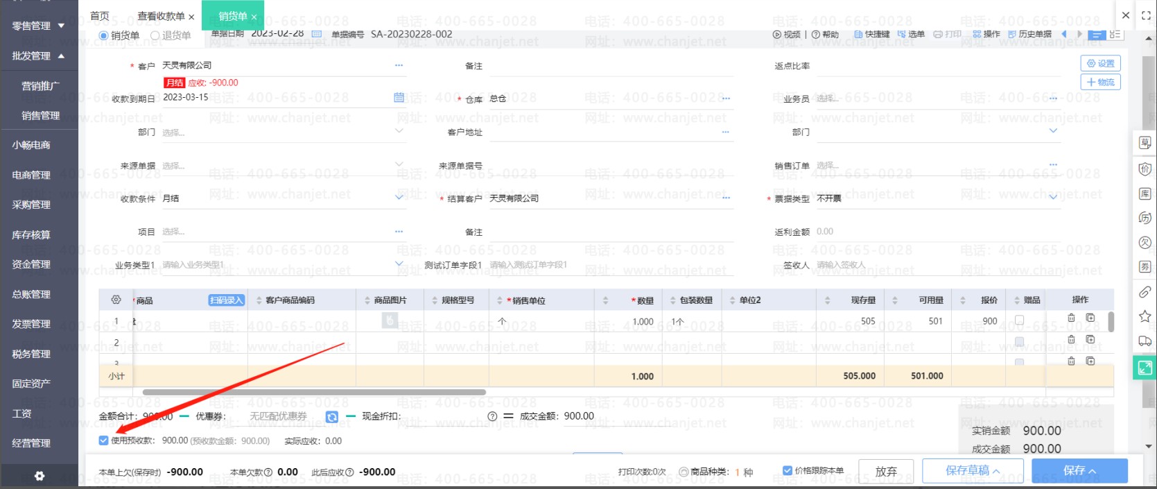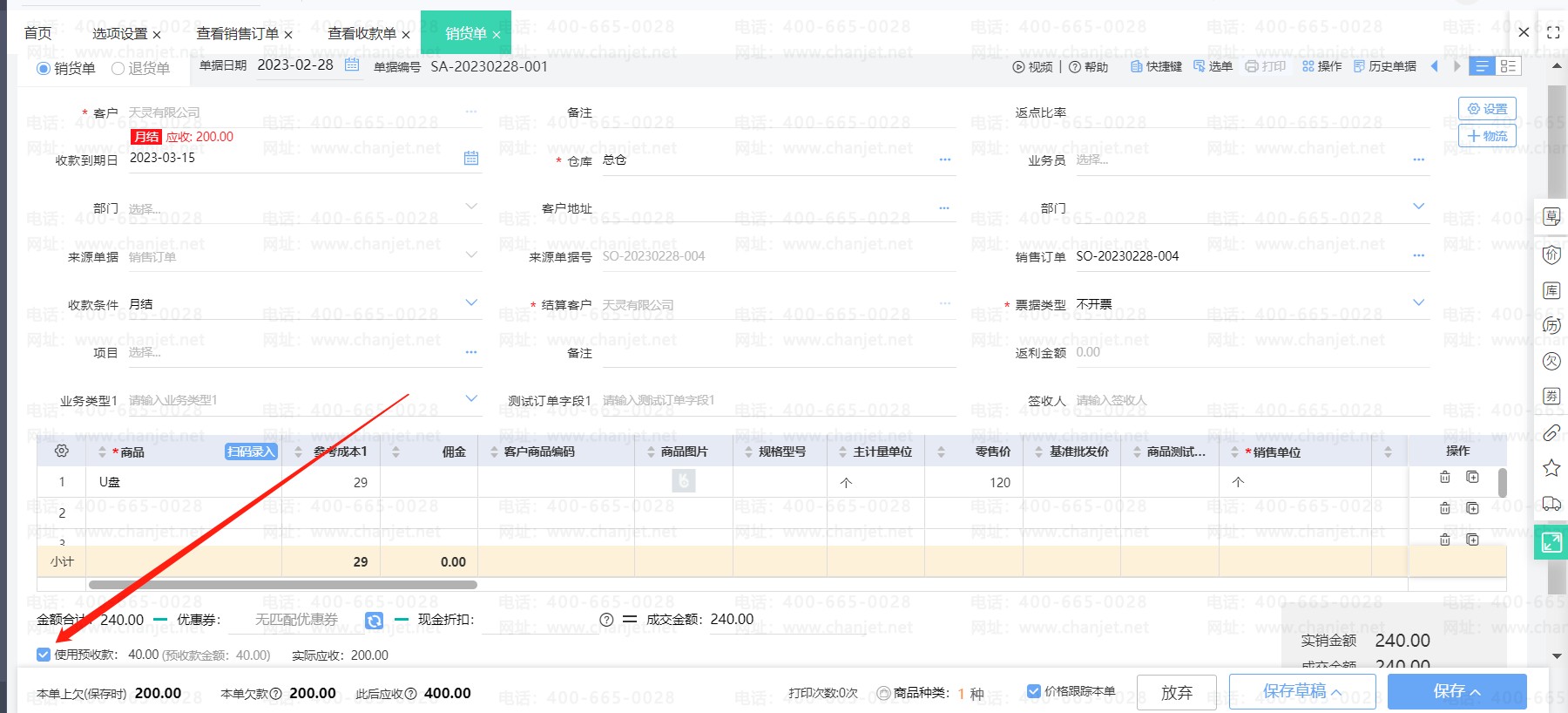 在销货单上勾选使用预收款