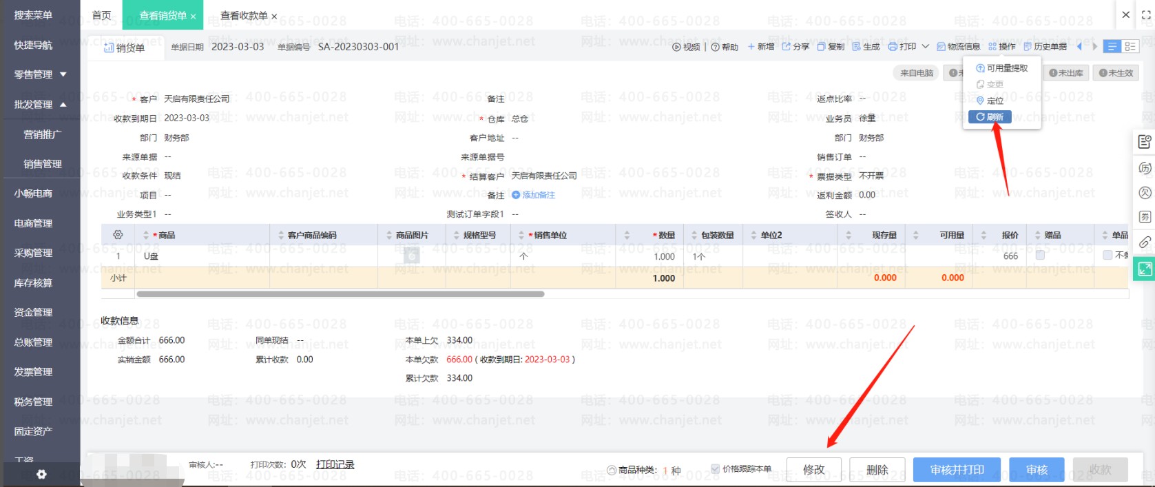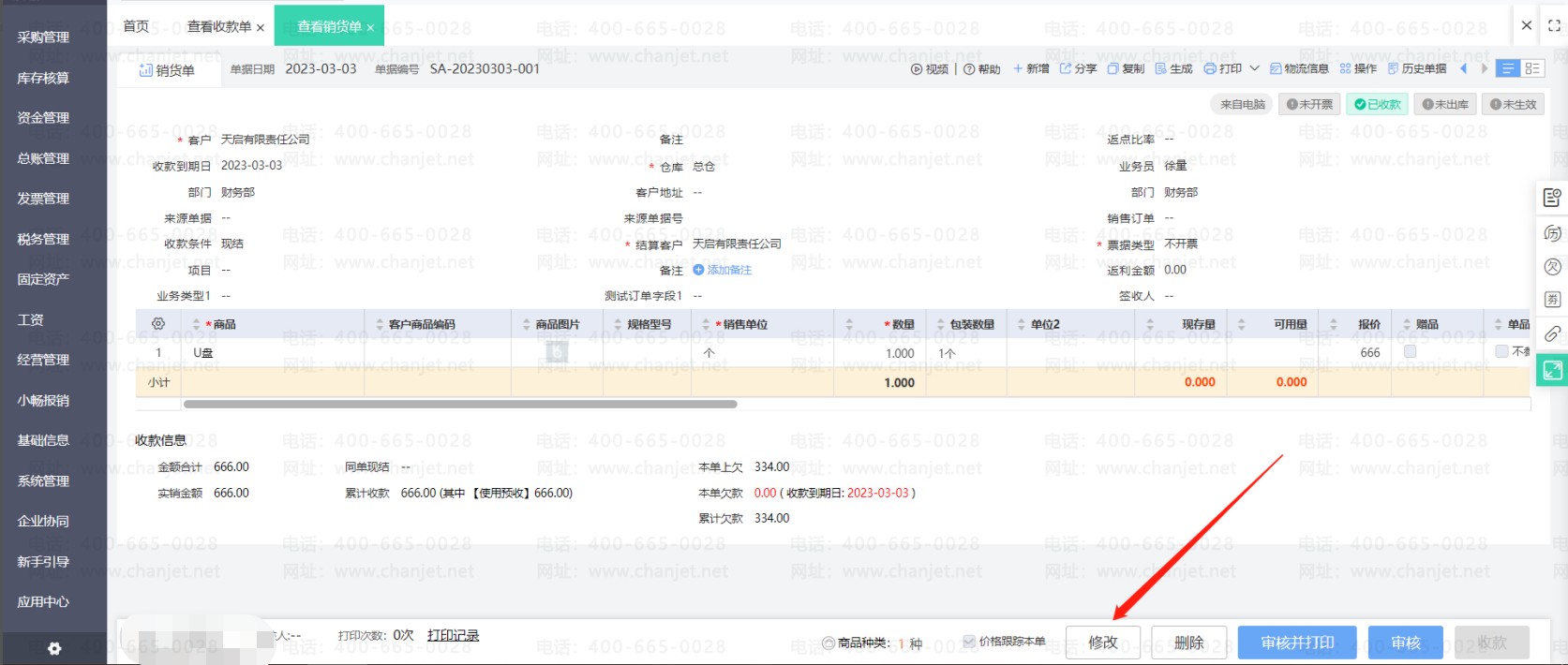 点击修改销货单(如果销货单有审核步骤要先弃审再修改),然后取消使用预收款的勾选,重新保存销货单后即可取消核销。然后刷新预收款单状态就可以修改单据了。