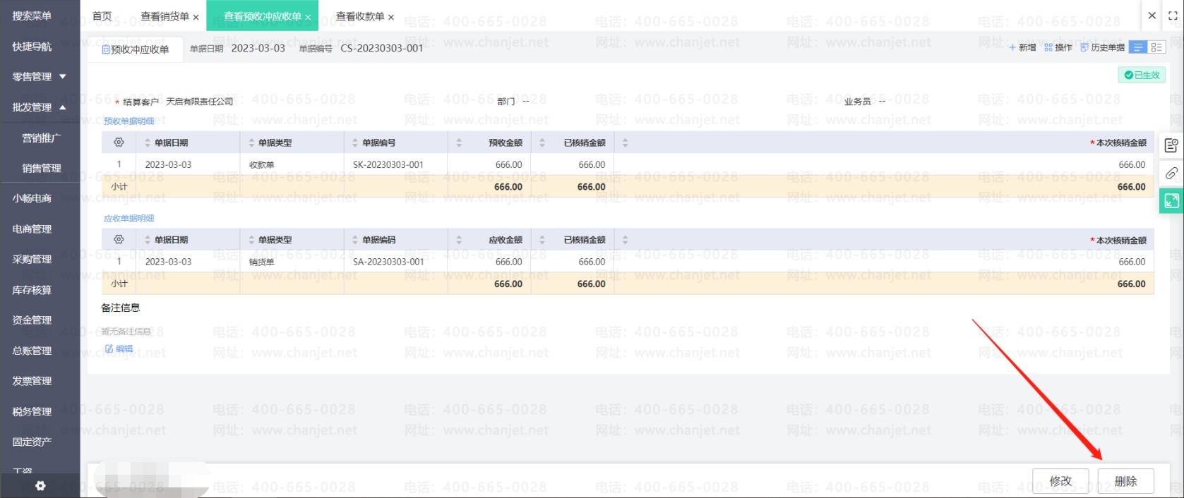 通过做预收冲应收单核销了预收款单和销货单。之后发现预收款单或者销货单内容有误需要修改,那么必选要先取消预收款单和销货单的核销,唯一的方式就是删除预收冲应收单。