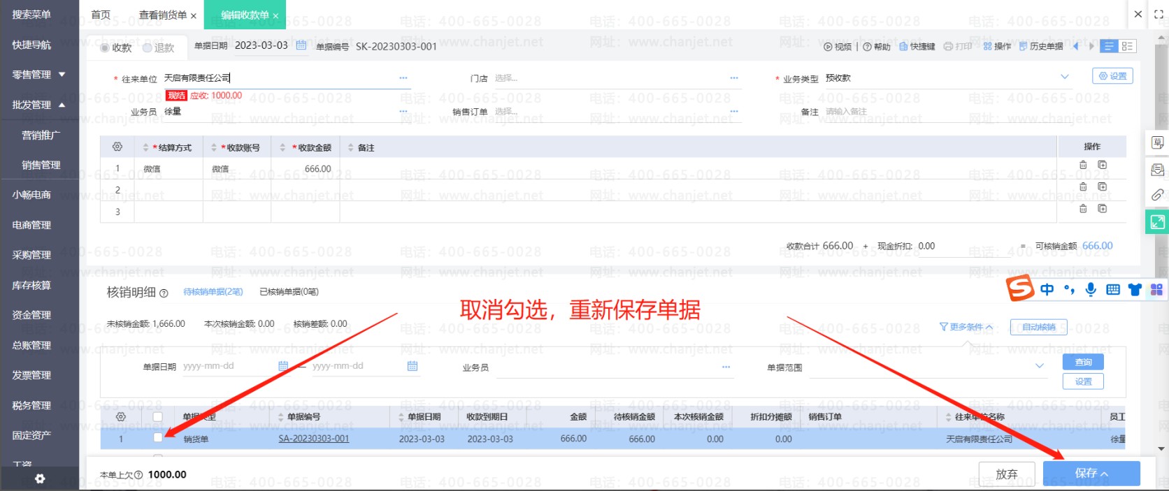 在预收款单下勾选销货单核销之后,如果要修改销货单的内容,那么需要先取消核销。