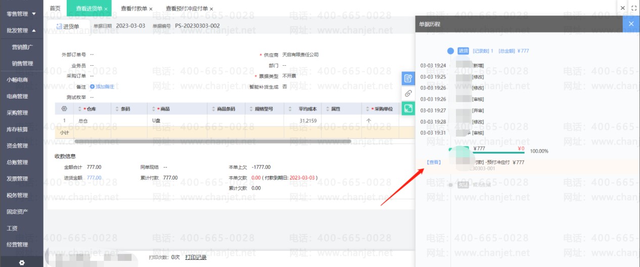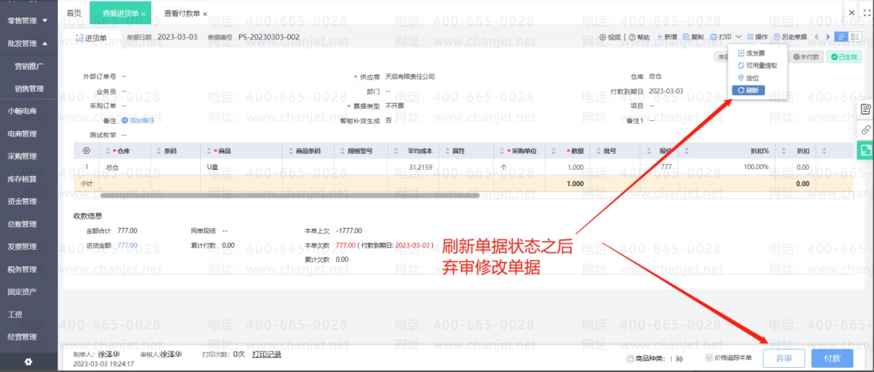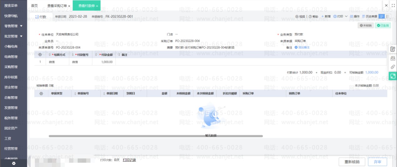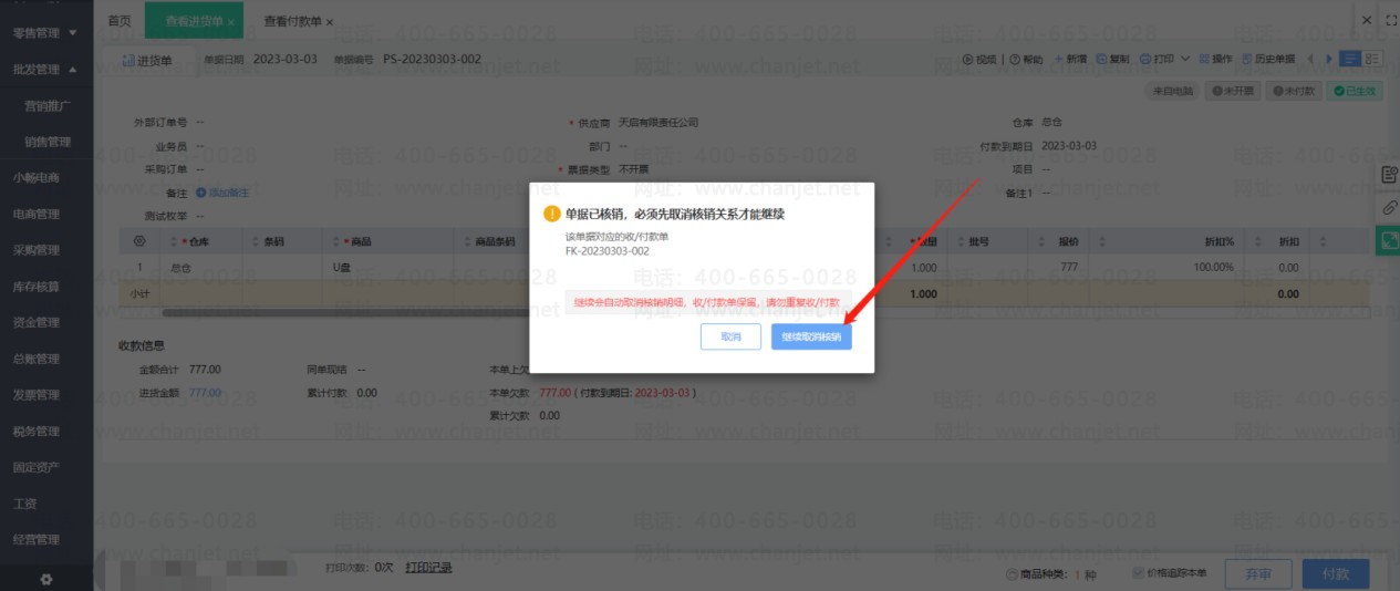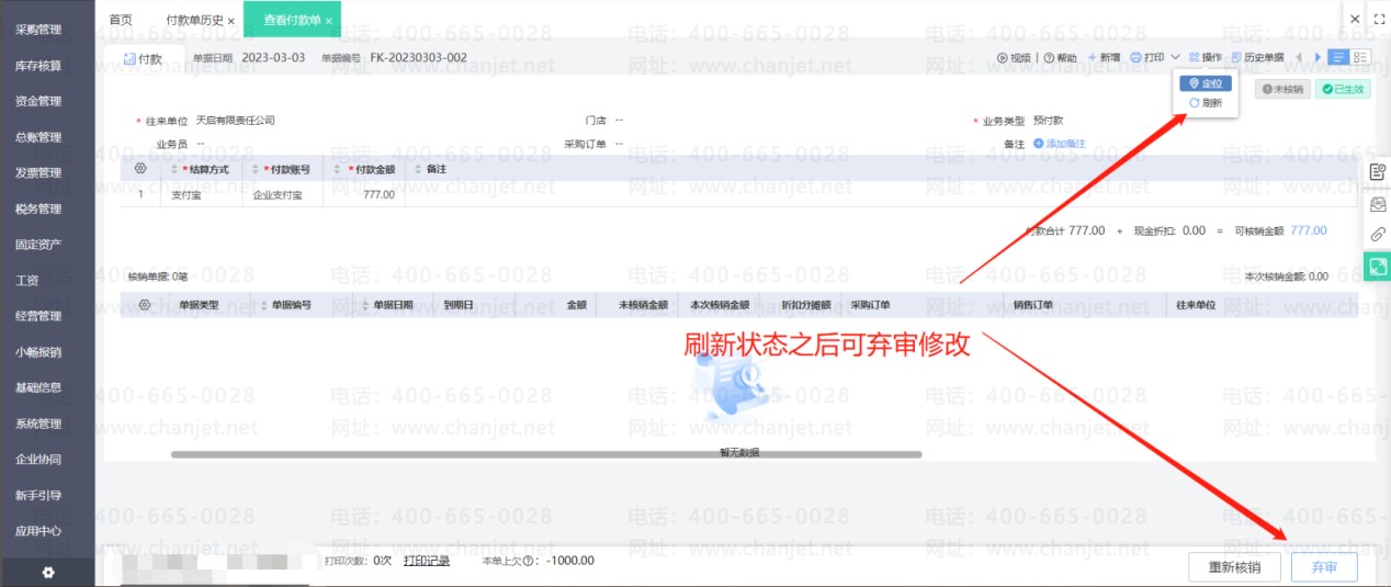 点击修改进货单(如果进货单有审核步骤要先弃审再修改),然后取消使用预付款的勾选,重新保存进货单后即可取消核销。然后刷新预付款单状态就可以修改单据了。