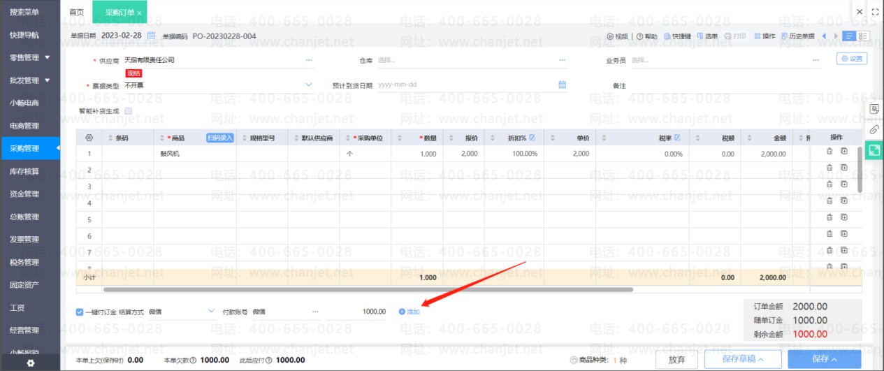 ① 做采购订单时预付供应商定金