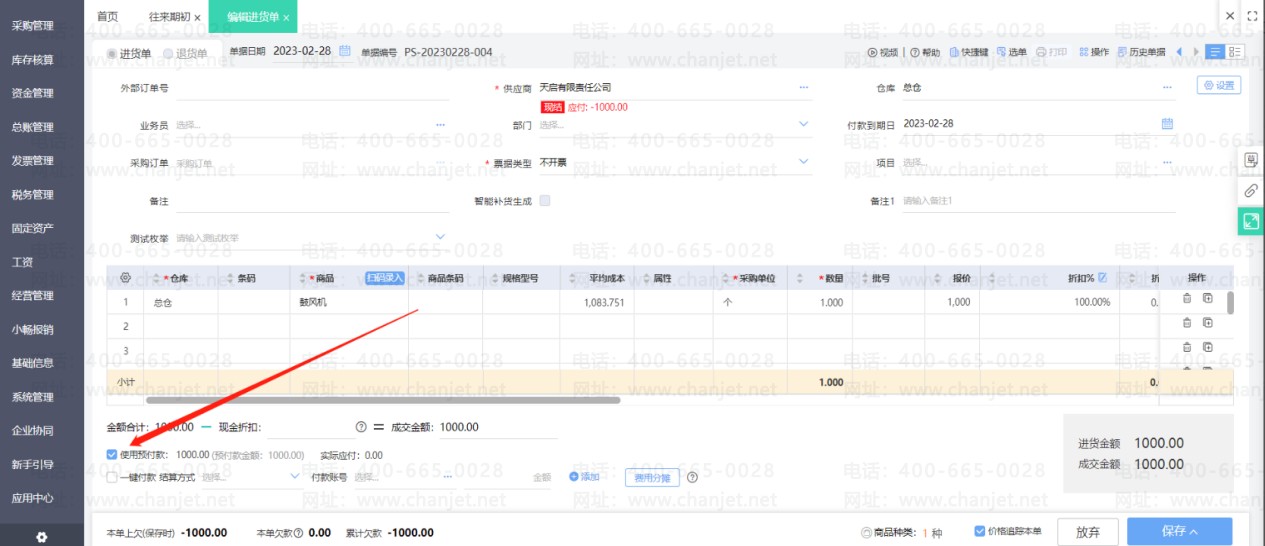 在进货单上勾选使用预付款