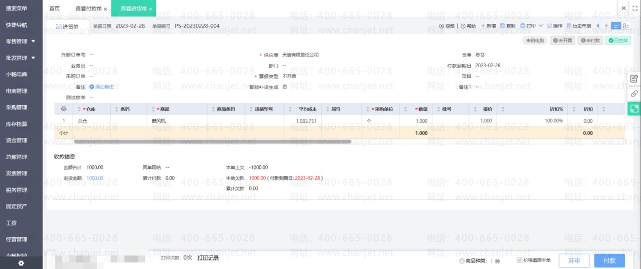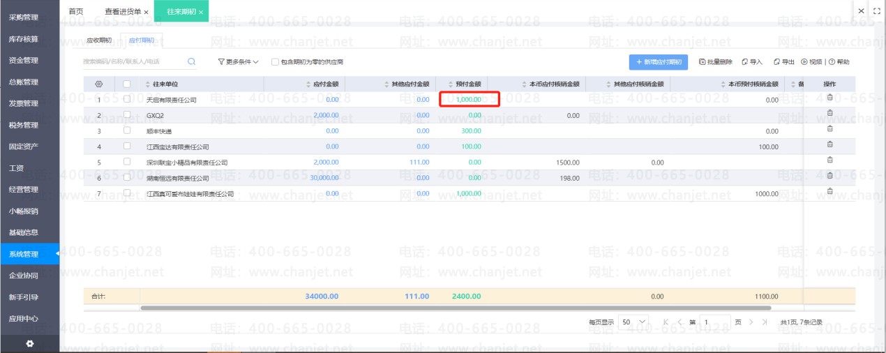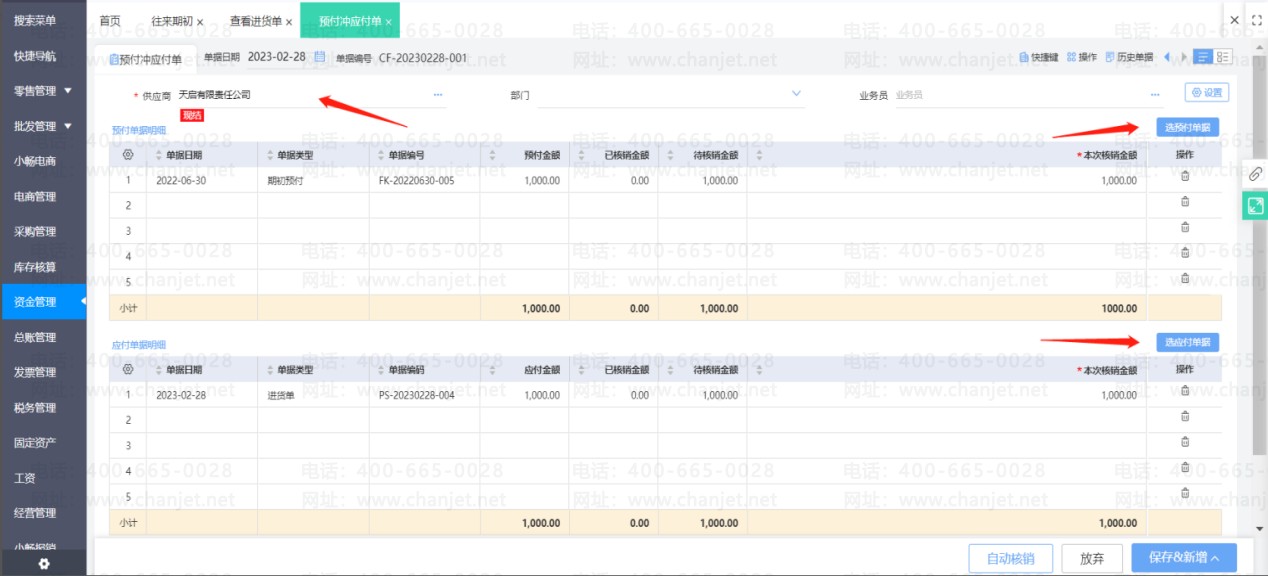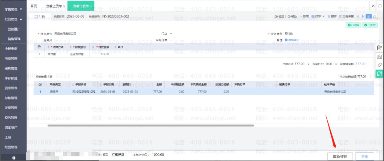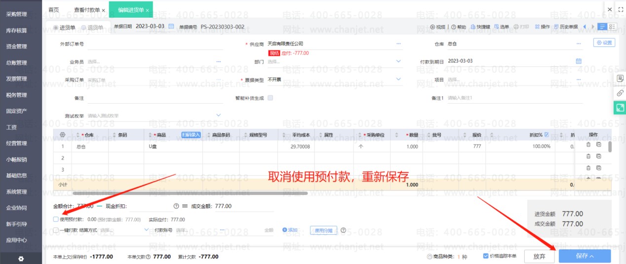 进货单上勾选使用了预付款之后,预付款单和进货单即核销。若之后发现预付款单需要修改一些内容,那么必须要先取消核销之后才能修改预付款单。
