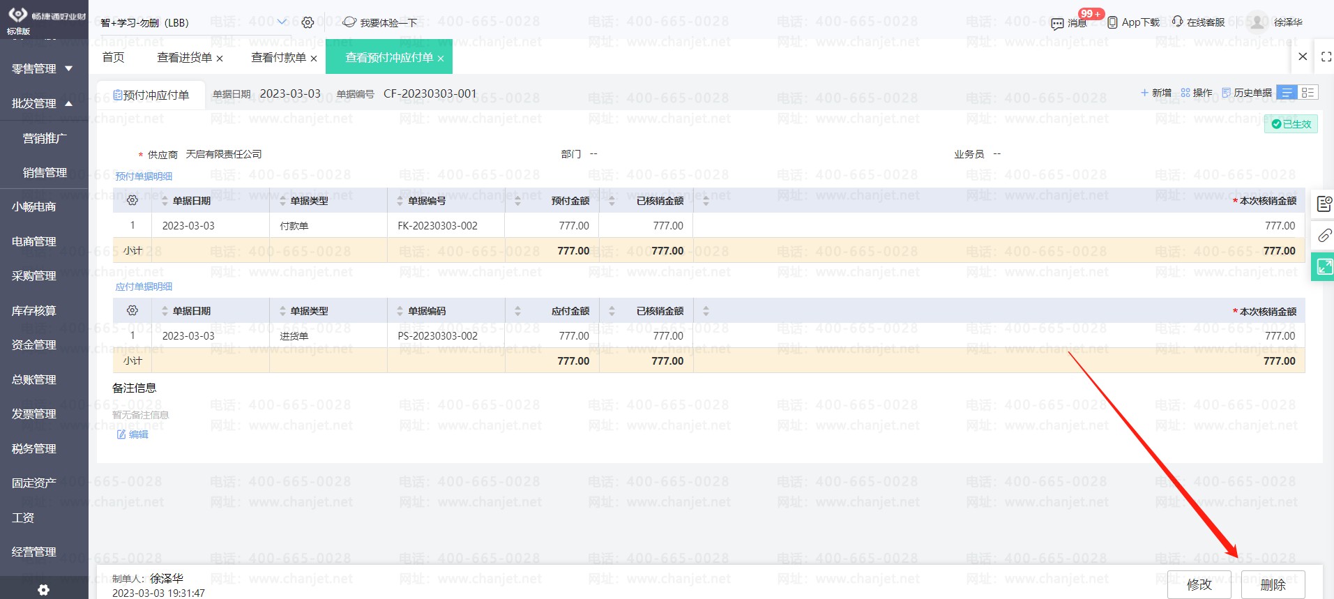 通过做预付冲应付单核销了预付款单和进货单。之后发现预付款单或者进货单内容有误需要修改,那么必选要先取消预付款单和进货单的核销,唯一的方式就是删除预付冲应付单。