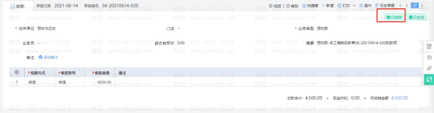 单据保存审核之后,状态显示为【已核销】。收款单可用来冲抵应收,保证应收明细账的余额为正确的数据。