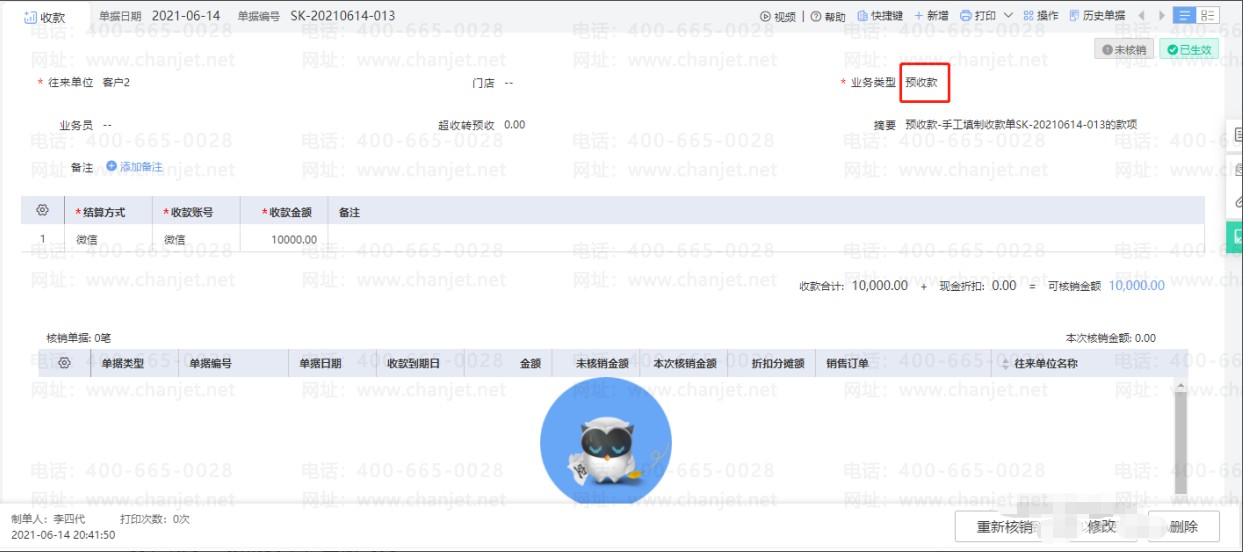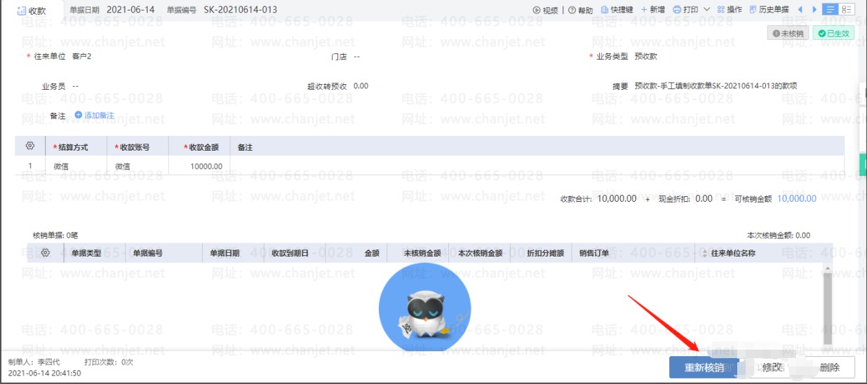 5.点击【单据编号】可打开对应的预收款单据。打开单据后,点击右下角的【重新核销】