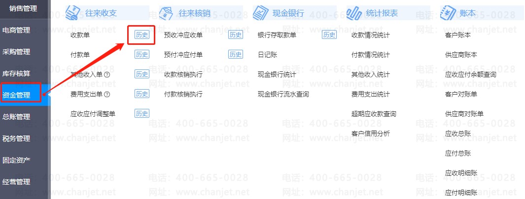 3.预收冲应收,销售业务发生后,需要使用预收款进行核销,可以点击【资金管理】-【收款单】后的【历史】菜单。