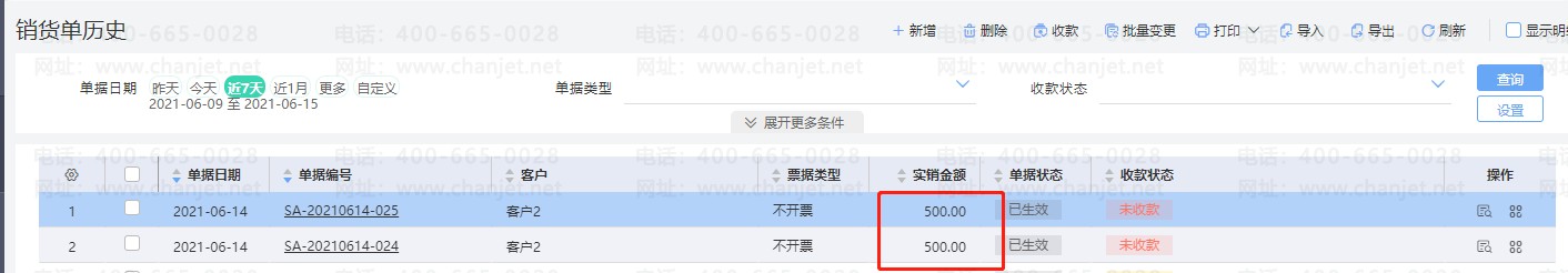 2.后续发生销售业务时,根据实际情况填写销货单。本示例中发生了两笔销售业务,做了一张销货单,金额均为500.