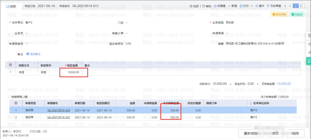 业务场景:预收客户一笔款项10000元,用于支付后续货款,当后续发生了销售业务之后,预收款如何和销货单进行核销?