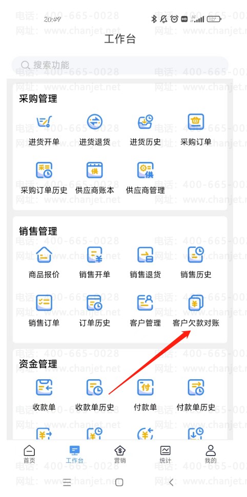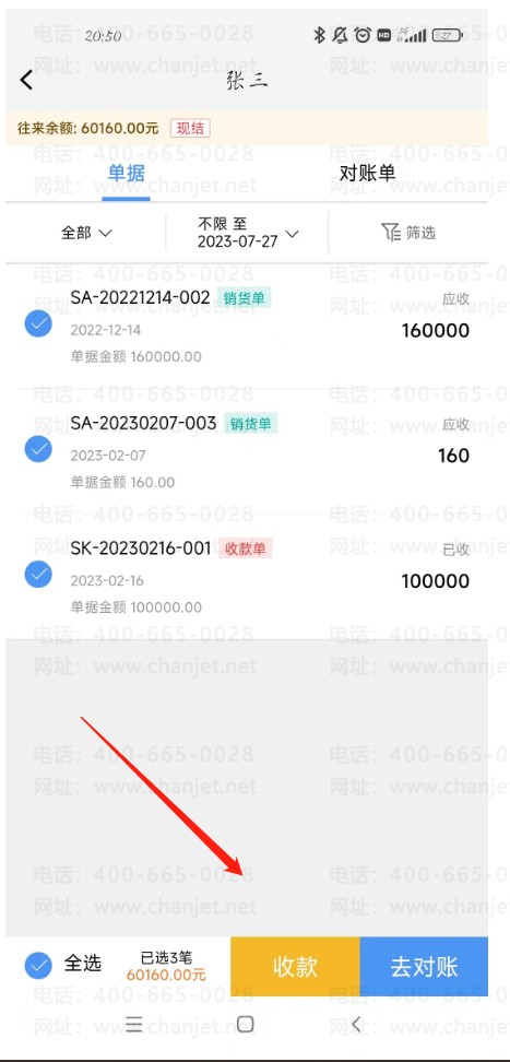 进入手机端,点击【工作台】,【销售管理】-【客户欠款及对账】,进入客户 对账单界面,找到需要核销的往来单位,选到该单位的多个销货单之后点击左下 角的【收款】,实现批量收款。
