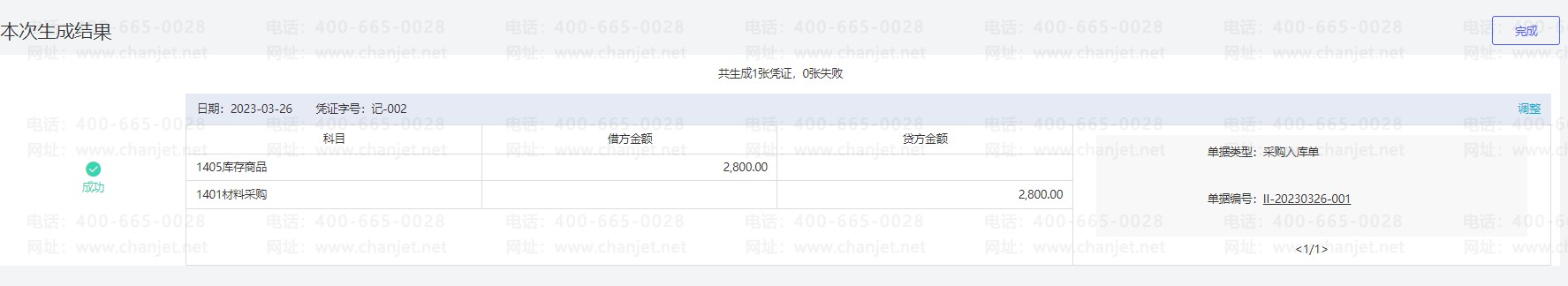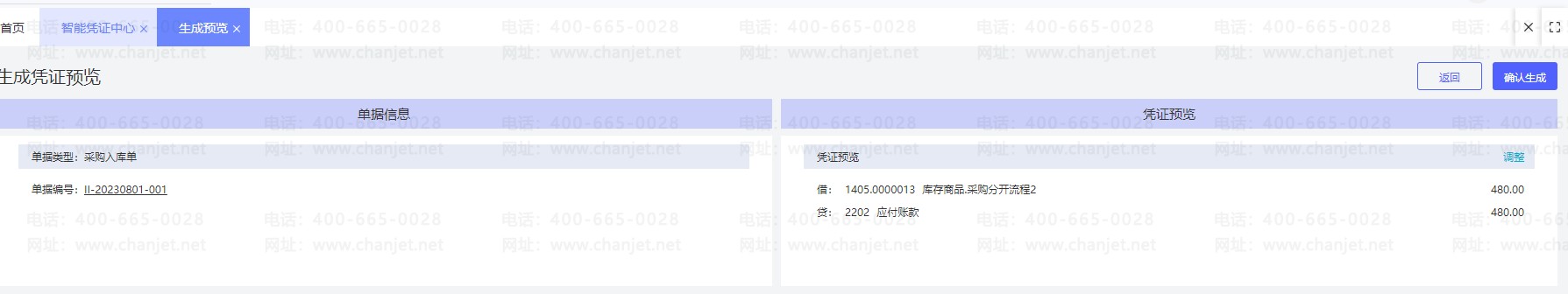 依次点击【总账管理】-【智能凭证中心】-【业务单据生成的凭证】点击【去生成】,单据类型找到采购入库单,勾选相应的单据之后点击【生成凭证】即可: