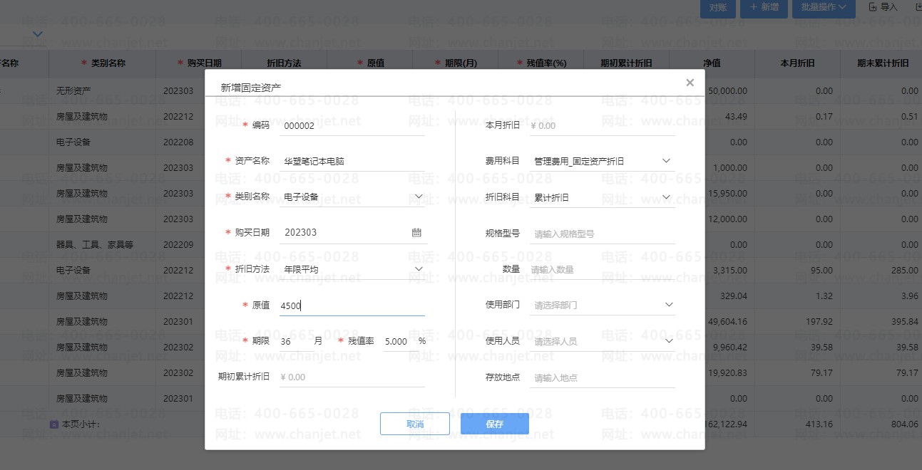 假设某公司在2023年3月需入账固定资产:在本月新购的一台华塑笔记本电脑,原值4500元、折旧年限36个月(年限平均法)、残值率5%;这个如何在软件中添加?