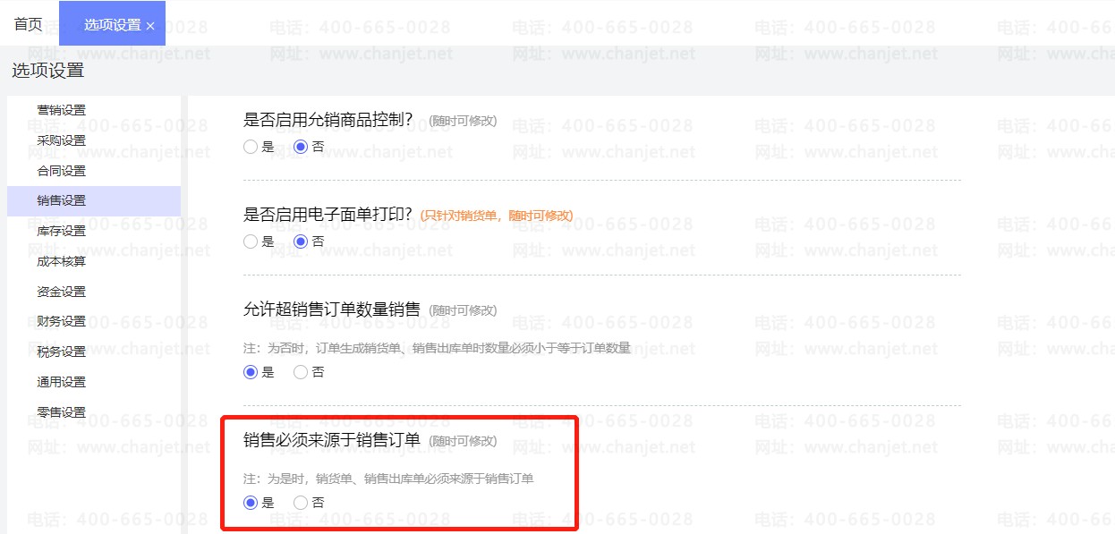 点击【系统管理】-【选项设置】找到【销售设置】中的【销售必须来源于销售订单】勾选【是】: