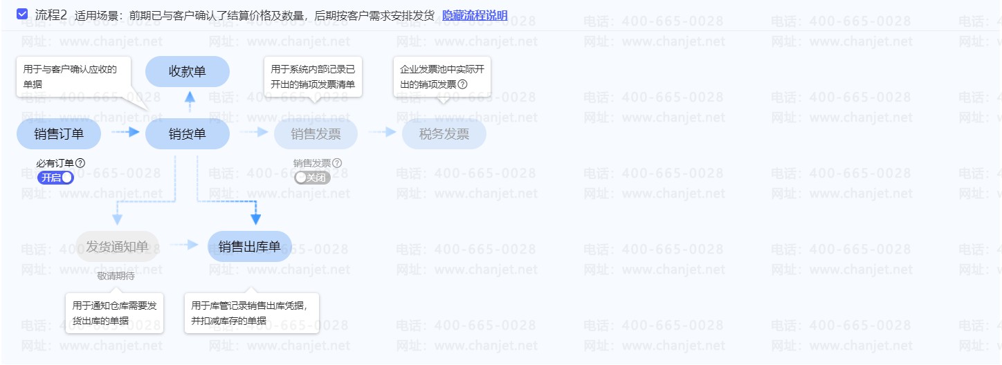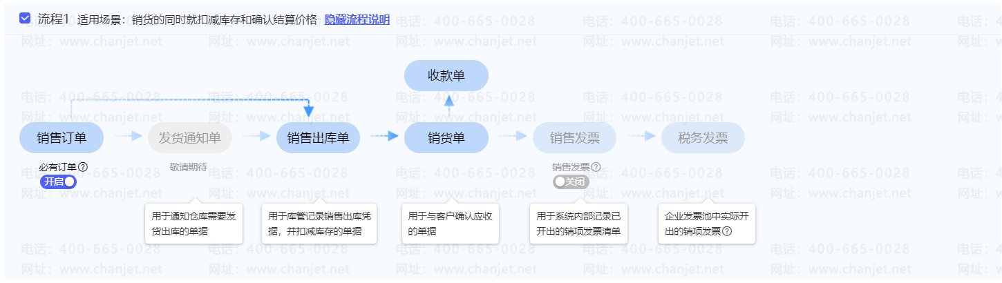 (1)销售流程:销售出库单确认库存,销货单确认应收
