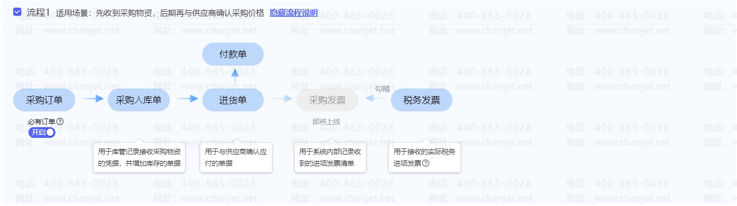采购流程同理,流程1是先收到物资生成采购入库单增加库存再生成进货单确认应付账款;流程2是先与供应商确定采购单价和数量,生成进货单,进货单确认应付账款做付款单,增加库存做采购入库单。