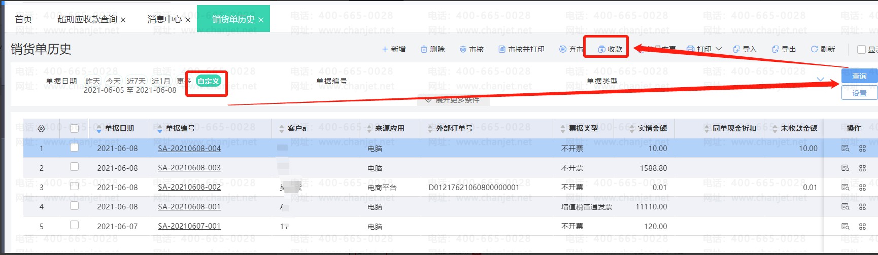 3、最后点击到相对应【销售管理】-【销货单历史】或者是【资金管理】-【客户对账单】,用于批量收款即可。