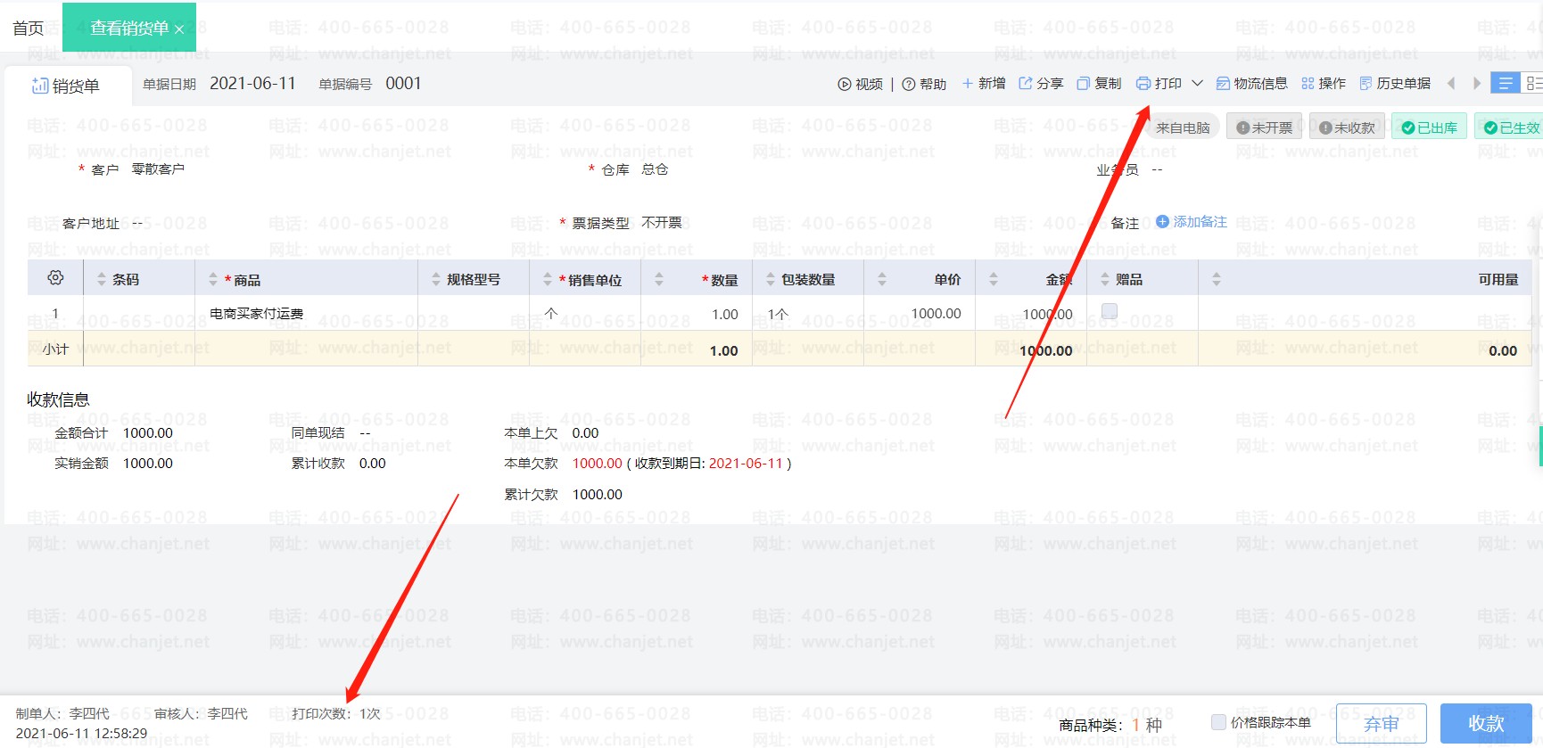 注:销货单未保存的情况下进行打印,本单上欠、未核销金额字段无法打印,单据保存生效后才可以打印显示。