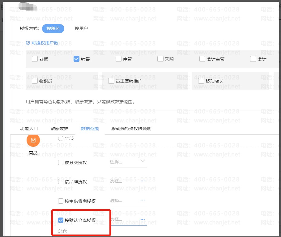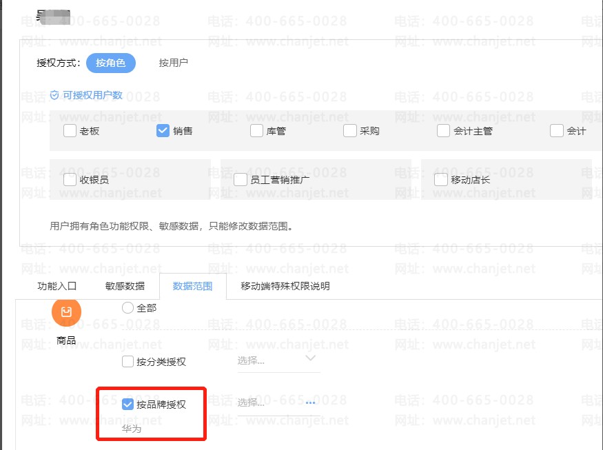 为了不让业务员存在乱销售商品,需要给不同业务员某些商品权限,让他们只能看到某类商品信息,之后做单也只能选到这些商品做,查询单据也只能查询到授权的这些商品信息,可以按照商品来授权。商品权限可按明细授权、按分类授权、按品牌授权、按主供货商授权、按默认仓库授权。