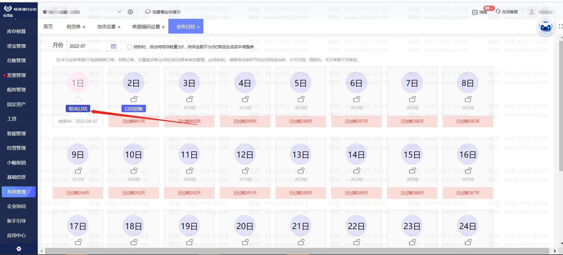 注:本日业务单据(不包括销售订单、采购订单、分量盘点单)必须生效(如果待审核、待审批的单据,必须审核生效),销售有出库环节时必须完成出库,才可日结。结账后,本日单据不可修改。