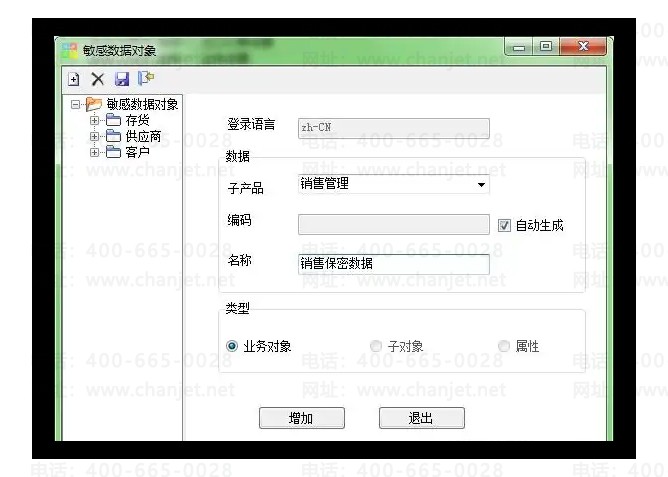在 “敏感数据维护工具” 中,点击 “增加”,选择子产品为【销售管理】,勾选 “编码自动生成”,自定义名称为 “销售保密数据”(类型默认 “业务对象”)。