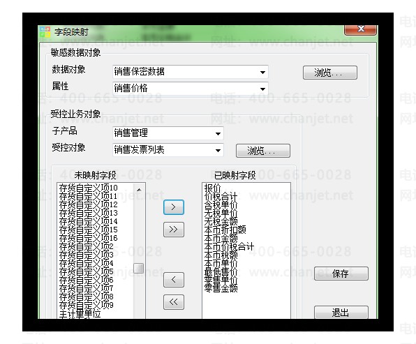选择子产品【销售管理】,明确需受控的业务对象(如销售发货单、销售发票、销售报表、列表等),将这些业务对象中 “销售单价、金额” 等需控制的字段,从 “未映射字段” 列表移至 “已映射字段” 列表,完成敏感属性与实际字段的关联。