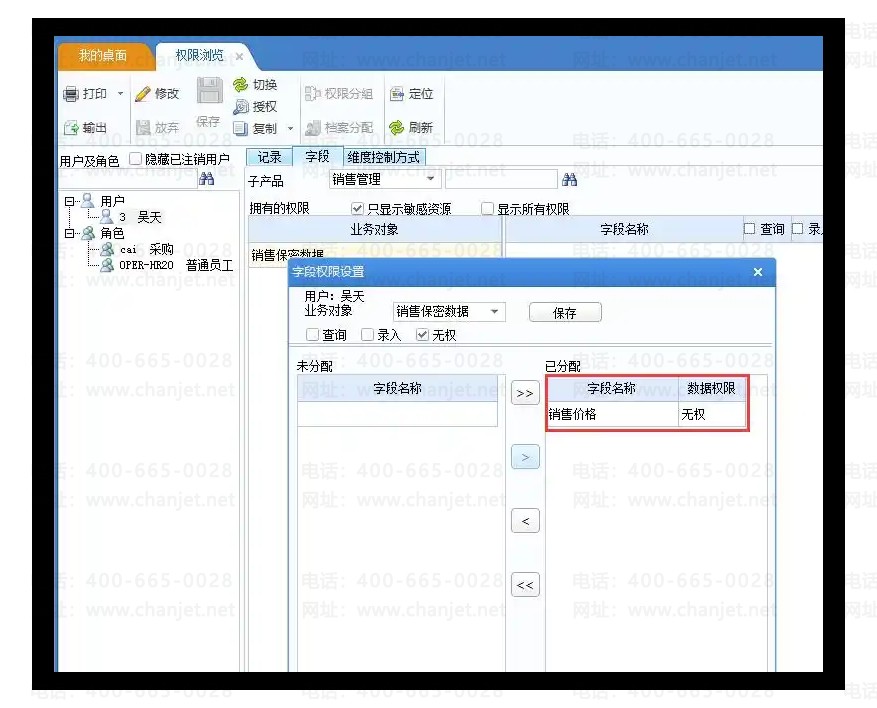 在 U8 系统中,点击【系统服务】—【权限】—【数据权限分配】,切换至【字段级】,选择需授权的操作员(如 “吴天”),在 “业务对象” 中选择 “销售保密数据”,设置其对 “销售价格” 属性的权限(如 “无权”“查询” 等,“无权” 与其他权限互斥)。