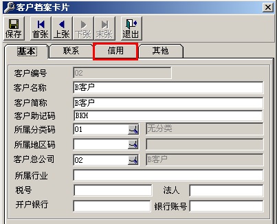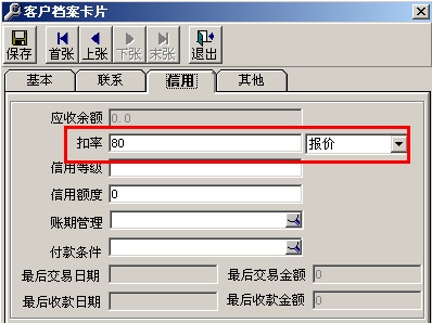 (2)增加客户B,点击“基础设置”-“往来单位”-“客户档案”—“增加”输入客户名称后点击“信用”,输入扣率80%后点击“保存”。