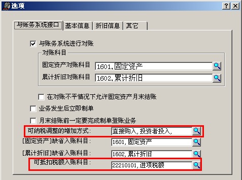 (1)首先打开用友通T3财务软件,在“固定资产”模块,点击“固定资产”—“设置”-“选项”-“与账务系统接口”,在“可纳税调整的增加方式”一栏里点击旁边的放大镜选择固定资产的增加方式,在“可抵扣税额入账科目”里再点击旁边的放大镜选择“进项税额”科目。