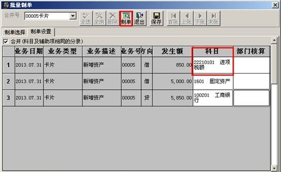 (4)在“制单设置”界面,科目下方自动带出进可抵扣进项税,再点击界面上的“制单”按钮,生成凭证。