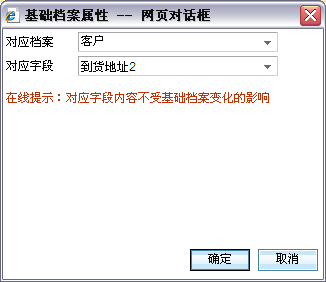 4、“对应档案”选择“客户”,“对应字段”选择“到货地址”,然后“确定”
