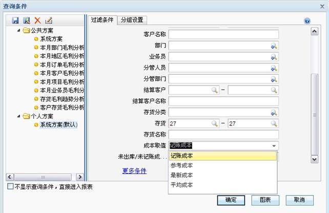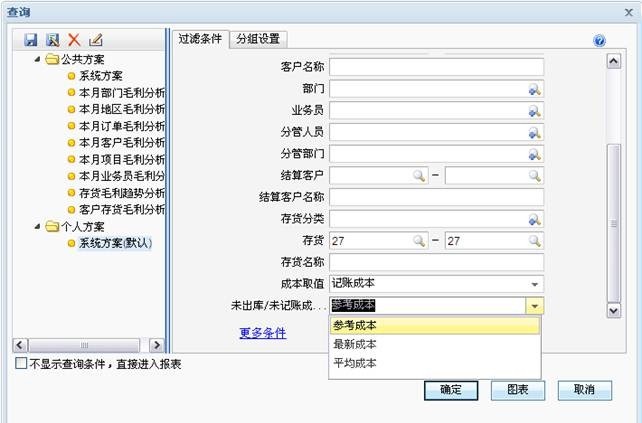未出库/未记账成本:是指未流转生成销售出库单的销货单或者是未审核的销售出库单,取值是取查询界面“未出库/未记账成本”选择的取值方式,
