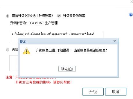 问题现象:用友畅捷通T+软件在进行升级帐套提示是测试版帐套,具体情况:账套备份的数据是用友T+12.0标准版本的,现在软件升级到畅捷通T+12.1专业版,但是帐套升级不了,已经打了畅捷通T+12.1专业版最新的补丁之后,升级数据仍然提示:升级账套出错,详细错误:当前账套是测试版账套!